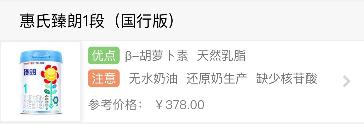 营养这块,臻朗1段含有2个特色强化配方,分别是β-胡萝卜素和天然乳脂。β-胡萝卜素可以促进宝宝视力发育,安全有效的补充维生素A。天然乳脂可以优化宝宝对钙和脂肪酸的吸收,还可以增加便便的柔软度,从而降低便秘的几率。另外,在6个常规强化配方中,臻朗1段只有5个,缺少了核苷酸,宝宝在1段这个阶段,普遍都没有添加辅食,奶粉是他们最主要甚至是唯一的营养来源,所以1段奶粉建议大家更多考虑6项常规强化配方齐全的产品。